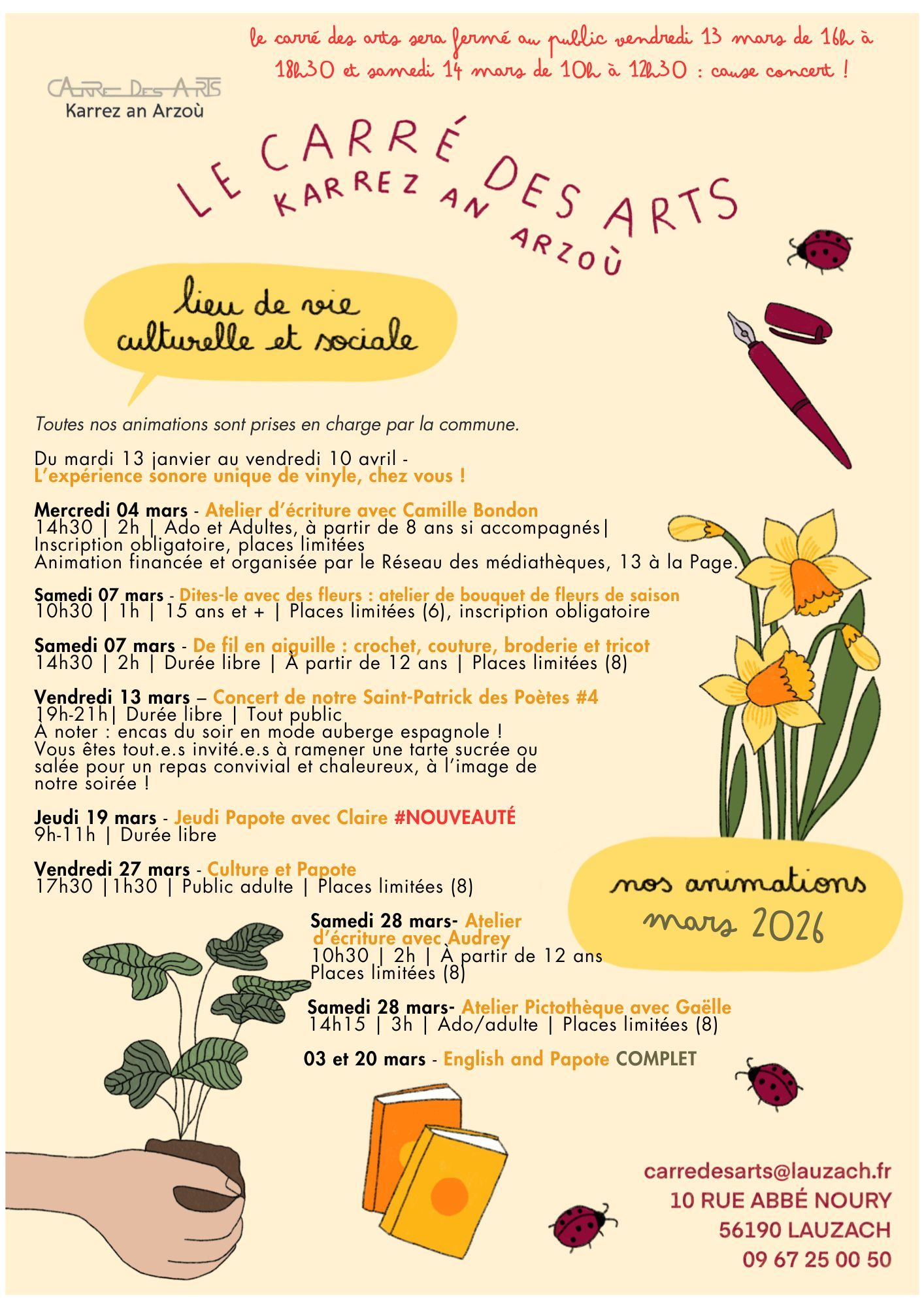 Retrouvez le programme du Carré des Arts de Lauzach du mois de mars 2026 : de nombreux rdv ouverts à tous, petits et grands, abonnés ou pas et peu importe votre lieu de résidence.